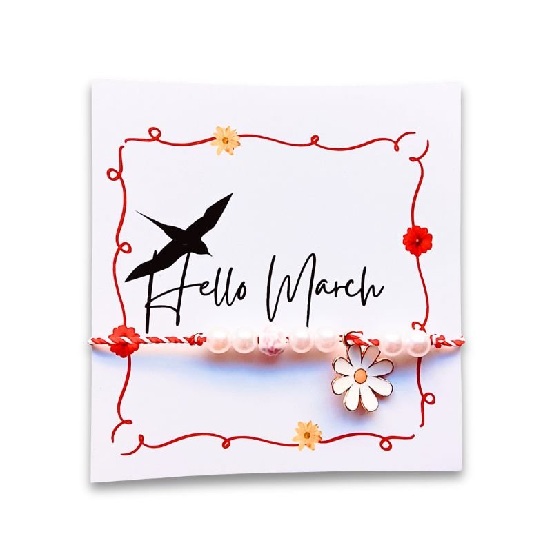 Γυναικείο βραχιόλι μαρτάκι με Μαργαρίτα από χυτό σμάλτο, πέρλες και κεραμική ζωγραφιστή χάντρα με άσπρο και κόκκινο κορδόνι.