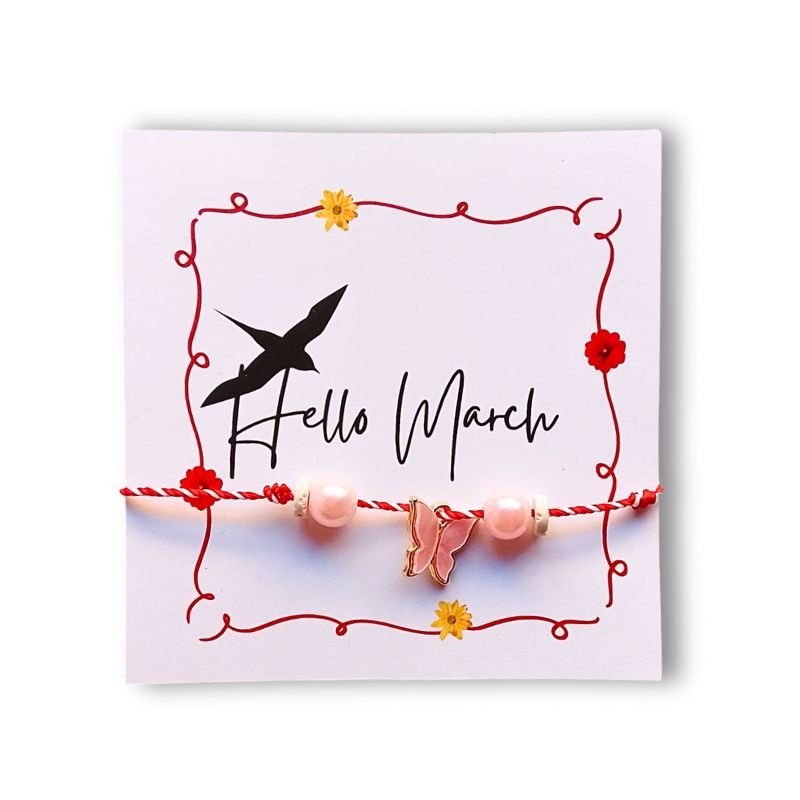 Γυναικείο και παιδικό βραχιόλι μαρτάκι με άσπρο και κόκκινο κορδόνι, ένα κομψό και διαχρονικό κόσμημα που συνδυάζει την παράδοση με τη σύγχρονη αισθητική με πεταλούδα με ροζ ακρυλικό χρώμα από φίλντισι. Με Μακραμέ αυξομειούμενο κλείσιμο για άνετη και προσαρμόσιμη εφαρμογή.