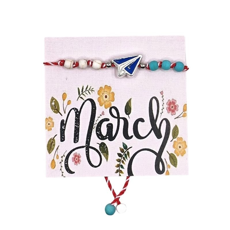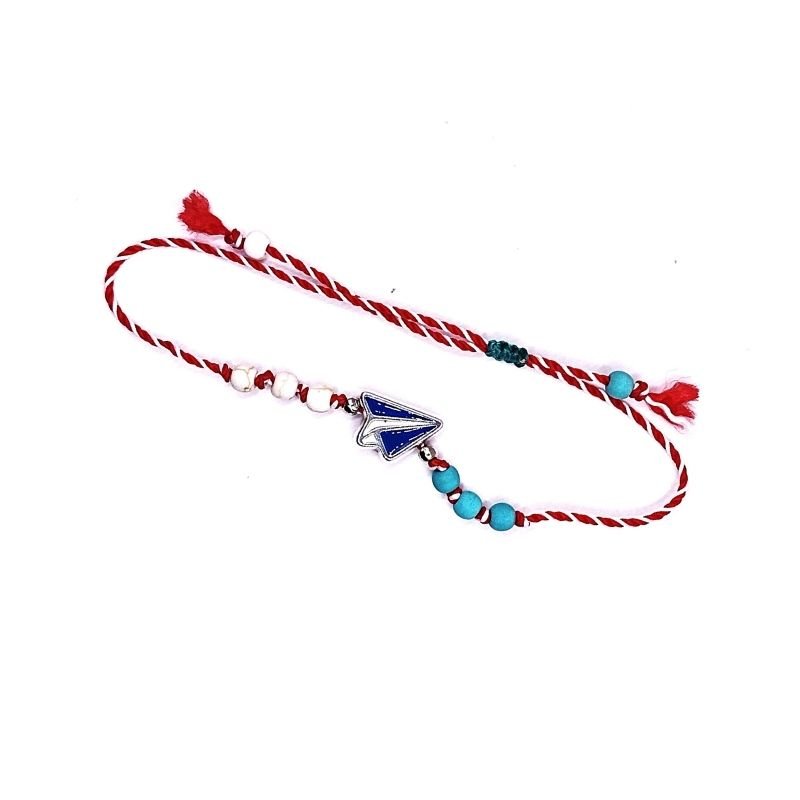 Μαρτάκι με μεταλλική Σαΐτα σε ασημί χρώμα και σμάλτο μπλε, και χαντρούλες χαολίτη σε γαλάζιο και λευκό χρώμα.