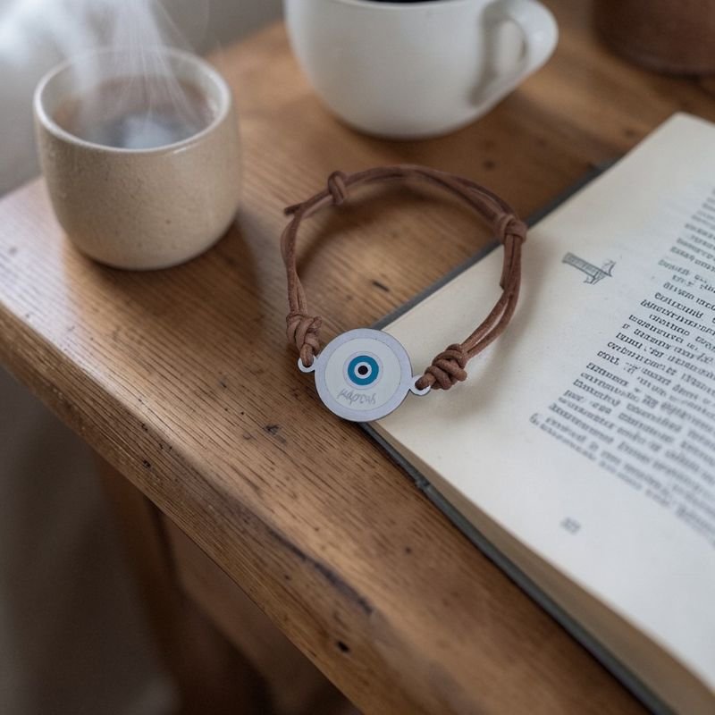Χειροποίητο μαρτάκι βραχιολάκι με ένα στρογγυλό ατσάλινο πλακέ στοιχείο με σμάλτο και δέρμα σε φυσικό χρώμα. Ενα βραχιολάκι με στρογγυλό στοιχείο, φωτεινό και στυλάτο με δυνατότητα αυξομείωσης. Ένα ιδανικό δώρο για τους αγαπημένους μας αλλά και για εμάς που ταιριάζει με πολλές εμφανίσεις. Ευκολοφόρετο και ελαφρύ.
