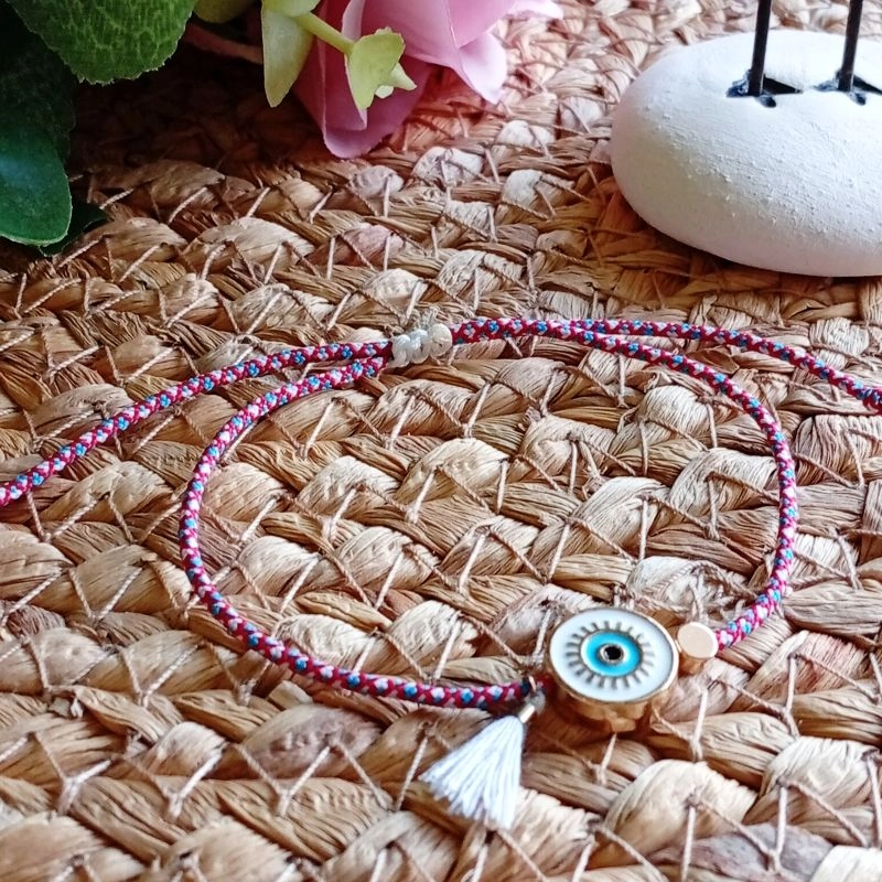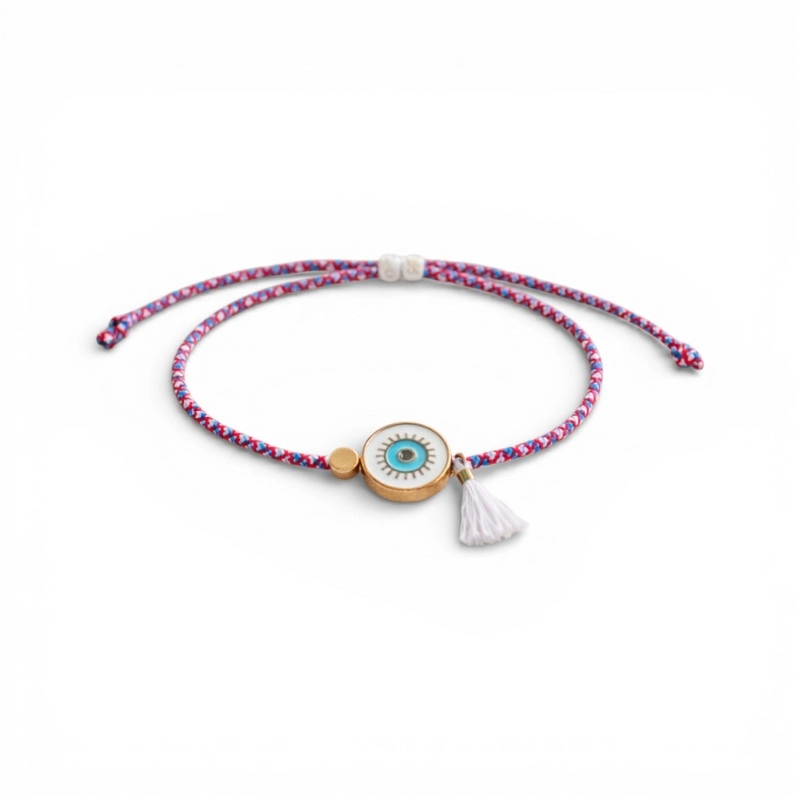 Βραχιόλι μαρτάκι με μεταλλικό μάτι με σμάλτο, μεταλλική στρογγυλή χάντρα και φουντίτσα.