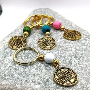 Μαρτυρικά μπρελόκ με ατσάλινο κρίκο και Κωνσταντινάτο σε χρυσό χρώμα. Χάντρα ξύλινη σε πολλά χρώματα για να ταιριάζει στη βάφτιση Πρωτότυπα χρηστικά διαχρονικά μπρελόκ που μπορούν να χρησιμοποιηθούν σε μαρτυρικά ή σε στοιχείο για μπομπονιέρα. Αποστέλλονται σε διακοσμημένο κουτάκι. (μόνο 20 τεμάχια διαθέσιμα).