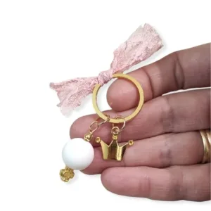 Μαρτυρικά μπρελόκ, με λευκή χάντρα 16mm, επιχρυσωμένα στοιχεία και δαντέλα σε σάπιο μήλο. Ενα πολύ όμορφο μαρτυρικό για βάπτιση με θέμα την πριγκίπισσα. Θα τα παραλάβετε μέσα σε κουτί αποστολών.