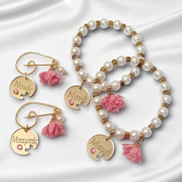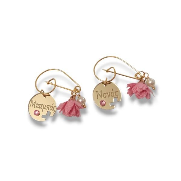 Μαρτυρικές παραμάνες για το μπαμπά και το νονό με ροζ υφασμάτινο φουντάκι, πέρλα και πλέξιγκλας στοιχείο με χάραξη.