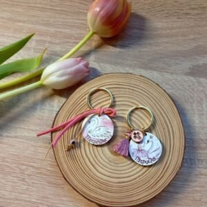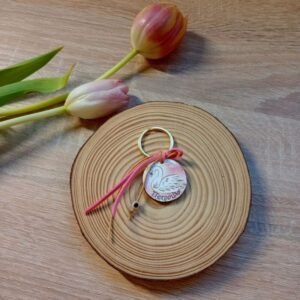 Μαρτυρικά βάπτισης μπρελόκ με εκτύπωση της επιλογής σας, ροζ σουέτ κορδόνι και ροζ ματάκι.