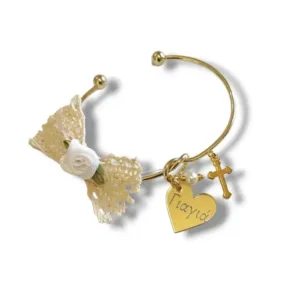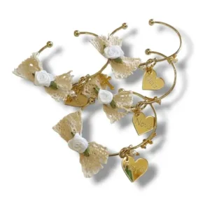Μαρτυρικά βραχιόλια επιχρυσωμένα για τη μαμά, νονά, γιαγιά, θεία και αδελφή. Είναι διακοσμημένα με εκρού βαμβακερή δαντέλα και λευκό τριανταφυλλάκι. Η καρδιά με τη χάραξη είναι πλεξιγκλας χρυσός καθρέφτης. Η τιμή είναι για το ένα βραχιόλι. Στις παραλλαγές μπορείτε να επιλέξετε τη χάραξη που θέλετε να έχουν. Θα τα παραλάβετε συσκευασμένα σε κουτί αποστολών. Στο κατάστημά μας θα βρείτε τα αντίστοιχα μαρτυρικά για τους καλεσμένους.
