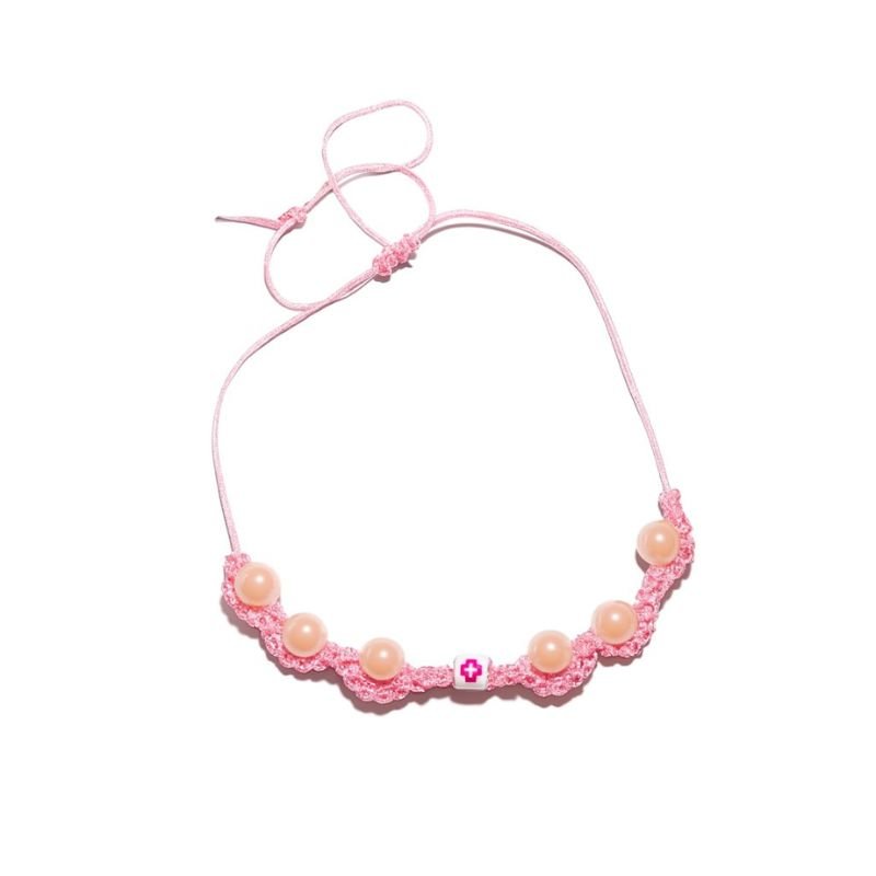 Μαρτυρικά βραχιόλια βάπτισης για κορίτσι με την τεχνική του μακραμέ περιέχει περαστές πέρλες και ακρυλική χάντρα με φούξια σταυρό.
