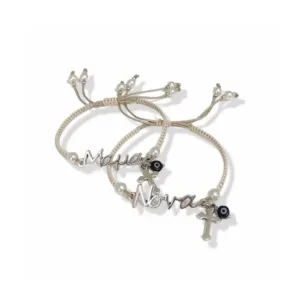 Μαρτυρικά βραχιόλια για τους κουμπάρους, μακραμέ, αυξομειούμενα. Το κορδόνι είναι σε μπεζ χρώμα και τα στοιχεία είναι ασημί.
