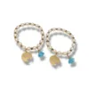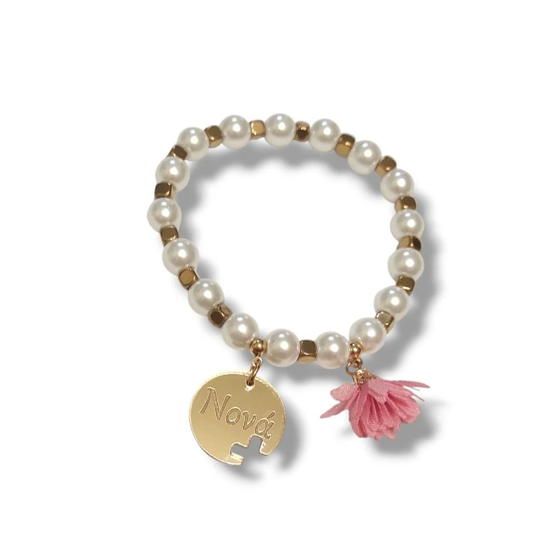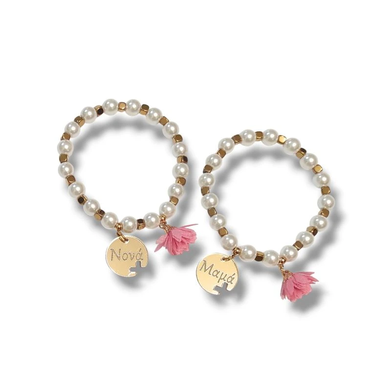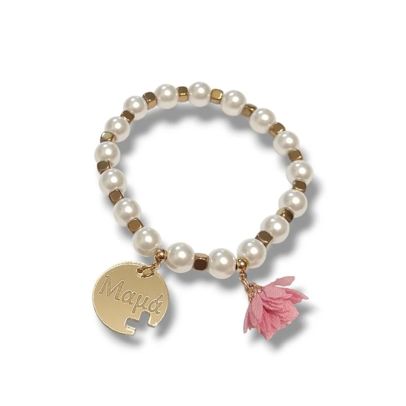 Ελαστικά μαρτυρικά βραχιόλια με λευκές γυάλινες πέρλες, χάντρες από αιματίτη και ροζ υφασμάτινο φουντάκι. Το στοιχείο με τη χάραξη είναι πλέξιγκλας χρυσός καθρέφτης.