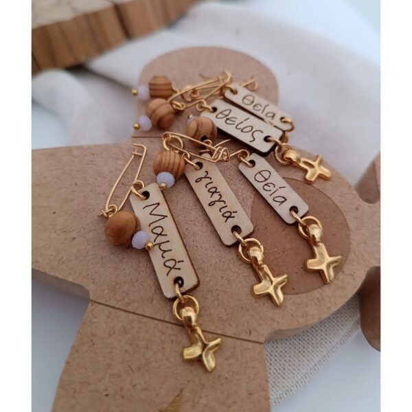 Μαρτυρικό πέτου μπαμπάς , μαμά, νονός ,νονά παππούς , γιαγιά, θεία , θείος σε ξύλινη ταυτότητα κ καρφίτσα με ξύλινη χάντρα κ με γαλάζια η ροζ χάντρα ανάλογα με το θέμα σας.