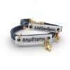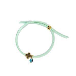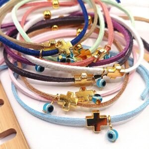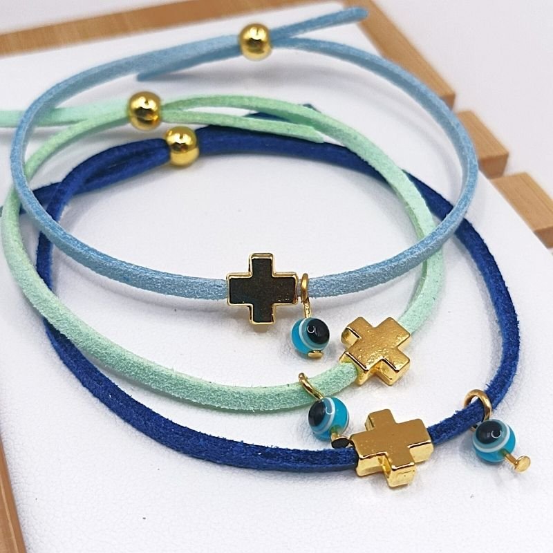 Minimal μαρτυρικό βραχιολάκι με τετράγωνο περαστό σταυρουδάκι σε χρυσό χρώμα και κρεμαστό ματάκι μπίλια. Κορδόνι σουέντ πλακέ σε πολλά χρώματα με ρυθμιζόμενο μήκος. Αποστέλλεται σε διακοσμημένο κουτάκι (για πάνω από 20 τεμάχια)
