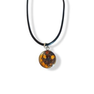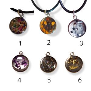 Κολιέ με μενταγιόν από υγρό γυαλί (ρητίνη) φτιαγμένο στο χέρι. Διάφορα σχέδια στο εσωτερικό όπως καρδούλες, αστεράκια, πετράδια και άλλα.