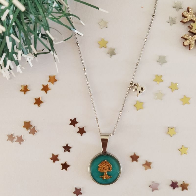 Τιρκουάζ χρώμα με ασημί καστόνι , χρυσό το Δένδρο της Ζωής και ασημένια αλυσίδα, όλα ατσάλινα.