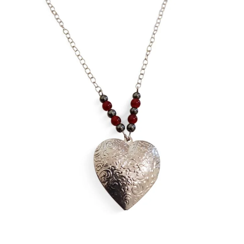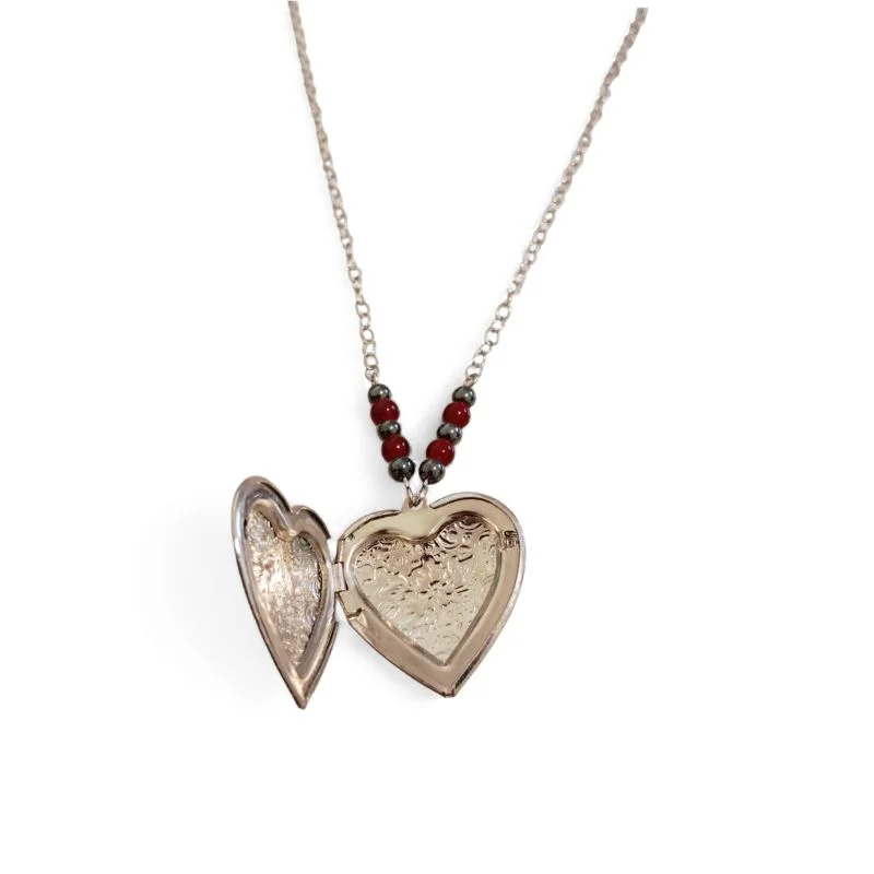 Ατσάλινο κολιέ με καρδιές που παίρνει φωτογραφίες μέσα με χάντρες αιματίτη και γυάλινες.