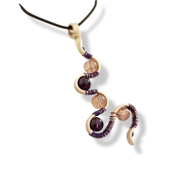 Ένα χειροποίητο μενταγιόν από πλατύ σύρμα αλπακά, δουλεμένο με μπλε σύρμα και στολισμένο με 2 μωβ και 3 μπεζ γυάλινες χάντρες. Οι καμπύλες του και οι χρωματικές αντιθέσεις χαρίζουν στο κόσμημα δυναμισμό και κομψότητα. Κρεμασμένο σε μαύρο κορδόνι, αποτελεί μια statement επιλογή για όσους αγαπούν το ιδιαίτερο και αυθεντικό στυλ.