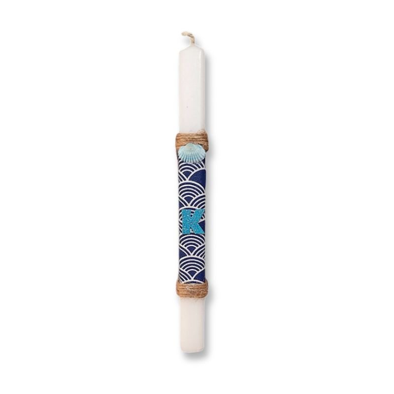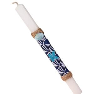 Μίνιμαλ αντρικό λαμπαδάκι τετράγωνο λευκό αρωματικό (22 χ 2 εκ. ) διακοσμημένο με ύφασμα μπλε-λευκό, φυσικό σχοινί, πεταλίδα τυρκουάζ και μονόγραμμα.