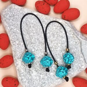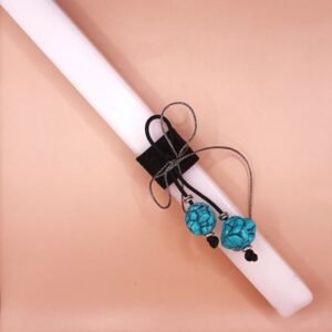 Λευκή αρωματική τετράγωνη λαμπάδα (διαστάσεις 30χ2χ2) και μπεγλέρι με χάντρες τιρκουάζ σε κορδόνι μαύρο συνθετικό (20εκ) και μεταλλικές λεπτομέρειες σε ασημί ή χρυσό χρώμα. Αποστέλλεται σε κουτί με χαρούμενη ξεχωριστή διακόσμηση
