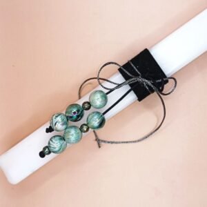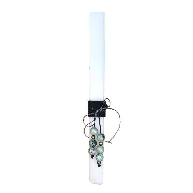 Λευκή αρωματική τετράγωνη λαμπάδα (διαστάσεις 30χ2χ2) και μπεγλέρι με μεντί περλέ χάντρες με νερά σε κορδόνι μαύρο συνθετικό (20εκ).