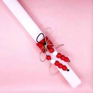 Λευκή αρωματική τετράγωνη λαμπάδα (διαστάσεις 30χ2χ2) και μπεγλέρι με ξύλινες χάντρες σε κόκκινο-λευκό χρώμα σε κορδόνι μαύρο συνθετικό (20εκ). Αποστέλλεται σε κουτί με χαρούμενη ξεχωριστή διακόσμηση