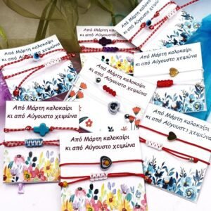 Σετ μαρτάκια με καρδούλα διάτρητη από αιματίτη σε συνθετικό κορδόνι κόκκινο, λευκό ή δίχρωμο. Τοποθετημένα σε πολύχρωμο καρτελάκι για ένα χαρούμενο καλωσόρισμα της Άνοιξης! Ιδανικό δώρο για μαμά, κόρες, αδελφές ή φίλες. (Το καρτελάκι πάνω στο οποίο θα είναι τοποθετημένο το βραχιόλι ενδέχεται να διαφέρει από το εικονιζόμενο)