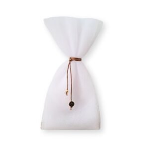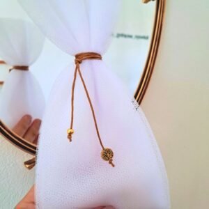 Κομψή και minimal Χειροποίητη μπομπονιέρα με διπλό γαλλικό τούλι, με καφέ κορδόνι, μπρονζέ διακοσμητικό δέντρο ζωής και χάντρα.