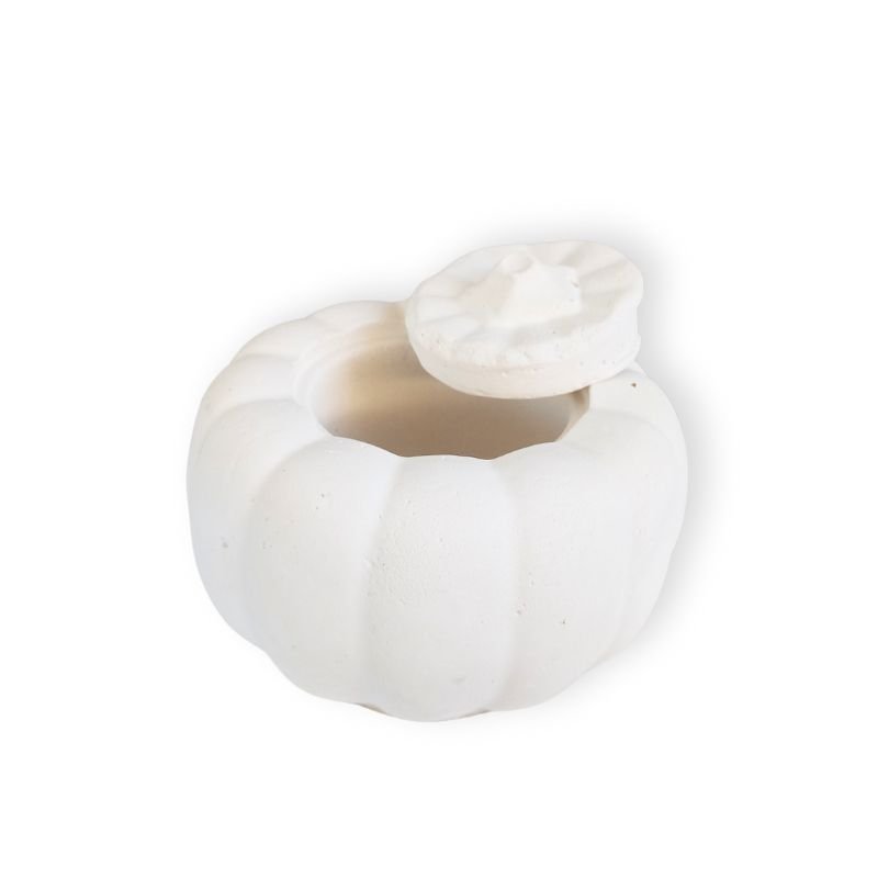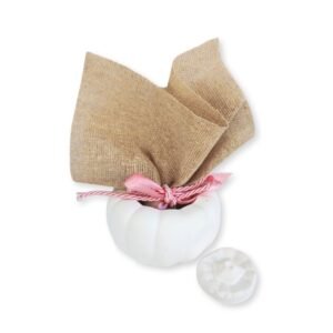 Χειροποίητη μπομπονιέρα σε σχήμα κολοκύθας, φτιαγμένη από λευκό, αδιάβροχο τσιμέντο, ασταρωμένη και βαμμένη προσεκτικά με λευκό χρώμα. Μπορεί να χρησιμοποιηθεί και μετά τη δεξίωση ως ρεσώ για ατμοσφαιρικό φωτισμό ή ως μικρή μπιζουτιέρα για τα κοσμήματά σας.