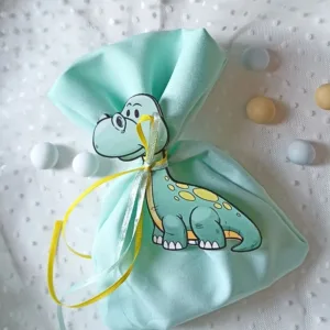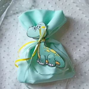 Βεραμάν πουγκί διακοσμημένο με ξύλινο δεινόσαυρο και κορδέλες σε κίτρινο και βεραμάν χρώμα, ιδανικό για μπομπονιέρα βάπτισης.