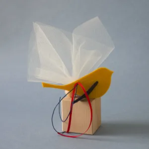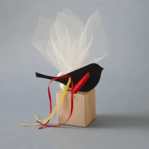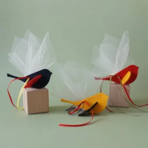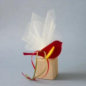 Μπομπονιέρα πουλάκι από τσόχα σε κόκκινο, κίτρινο και μπλε χρώμα.