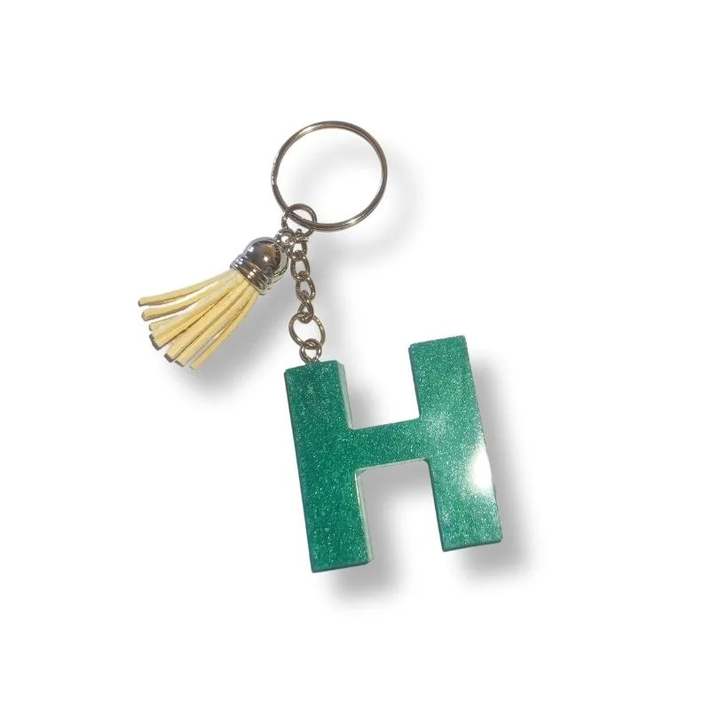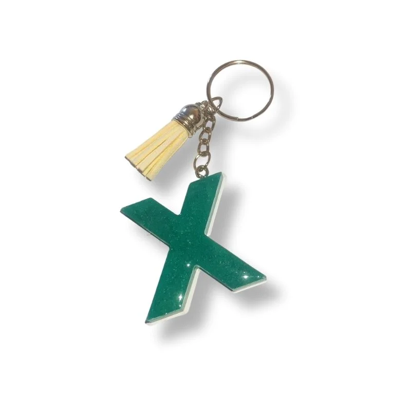 Μπρελόκ από υγρό γυαλί, μονόγραμμα σε πράσινο χρώμα με φουντίτσα.