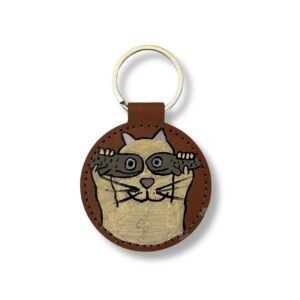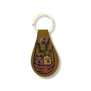 Μπρελόκ από δερματίνη, ζωγραφισμένο στο χέρι με ακρυλικά χρώματα, που συνδυάζει χιούμορ και παιχνιδιάρικη αισθητική με γατάκια.