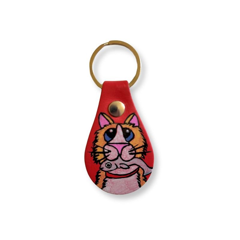 Μπρελόκ από δερματίνη, ζωγραφισμένο στο χέρι με ακρυλικά χρώματα, με γατούλα.