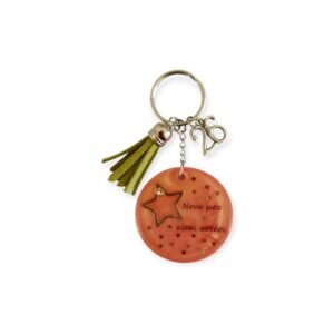 Στρογγυλό στοιχείο διαμέτρου 5 εκατοστών με μεταλλικό αστέρι και “Νονά μου είσαι αστέρι”.