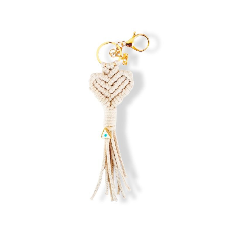 Χειροποίητο μπρελόκ γούρι 2026 μακραμέ καρδούλα σε χρώμα εκρού και φίλντισι ματάκι!