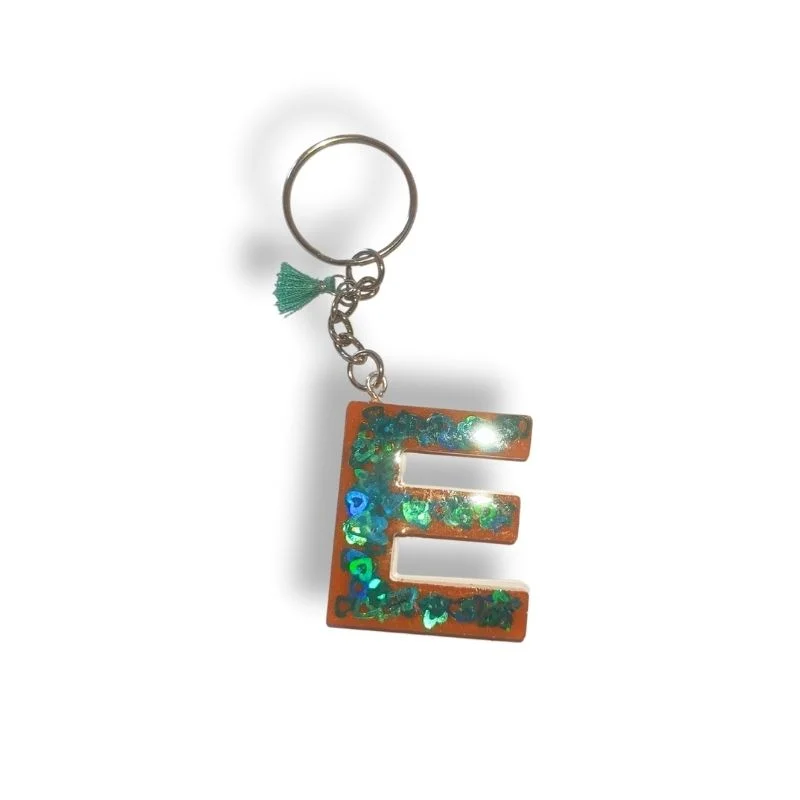 Μπρελόκ από υγρό γυαλί με βάση πορτοκαλί και ολογραφικές πράσινες καρδούλες.