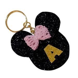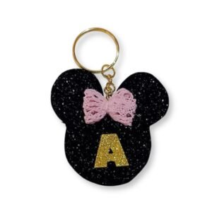 Χειροποίητο μπρελόκ minnie με μεταλλικό χρυσό κρίκο, απο φόαμ γκλίτερ σε μαύρο χρώμα με ροζ φιογκάκι. Στο μπρελόκ μπορούμε να προσθέσουμε το μονόγραμμα του παιδιού που θα το προσφέρετε.
