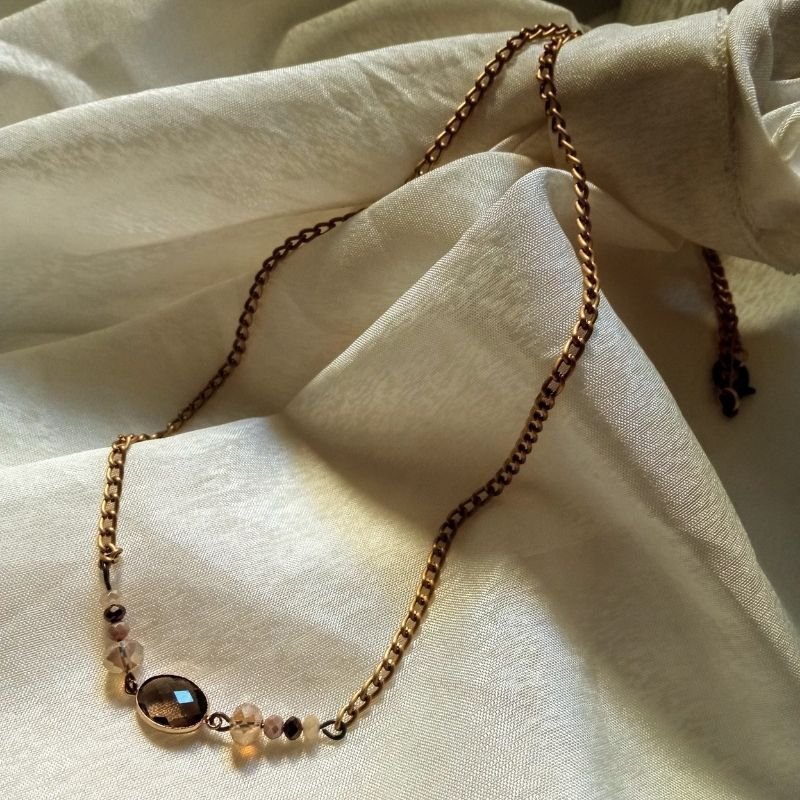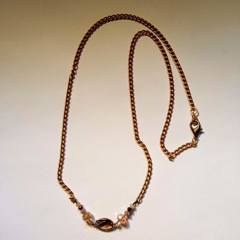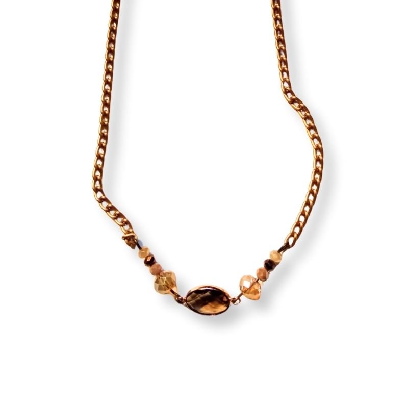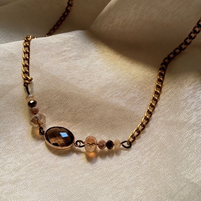 Κολιέ με κρύσταλλα σε αποχρώσεις καφέ-μπεζ και αλυσίδα αλουμινίου σε μπρονζέ χρώμα, σε στυλ vintage.