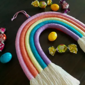 ΥΛΙΚΑ: Νήμα (45% βαμβακερό, 45% πολυακρυλικό), βαμβακερό σχοινί. Το πίσω μέρος του ουράνιου τόξου είναι επενδυμένο με ύφασμα, τσόχα ή χαρτόνι (ανάλογα τη διαθεσιμότητα), για μεγαλύτερη σταθερότητα.