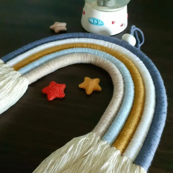ΥΛΙΚΑ: Νήμα (45% βαμβακερό, 45% πολυακρυλικό), βαμβακερό σχοινί. Το πίσω μέρος του ουράνιου τόξου είναι επενδυμένο με ύφασμα, τσόχα ή χαρτόνι (ανάλογα τη διαθεσιμότητα), για μεγαλύτερη σταθερότητα.