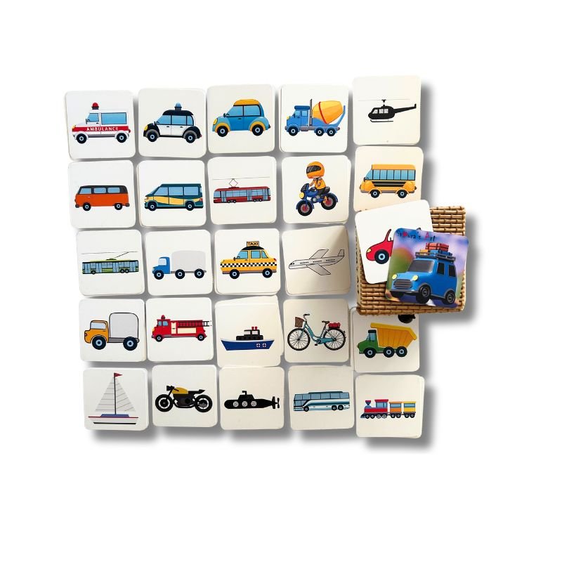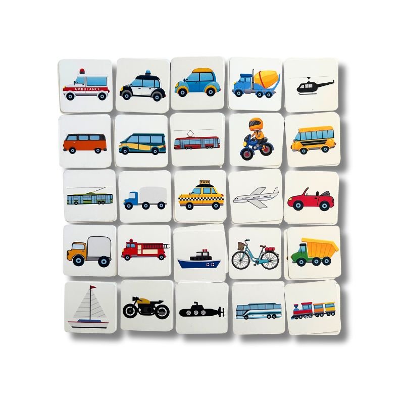 Διασκεδαστικό παιχνίδι μνήμης με τα οχήματα. Αποτελείται από 50 κάρτες {25 ζευγάρια} για να είναι πιο ενδιαφέρον.