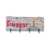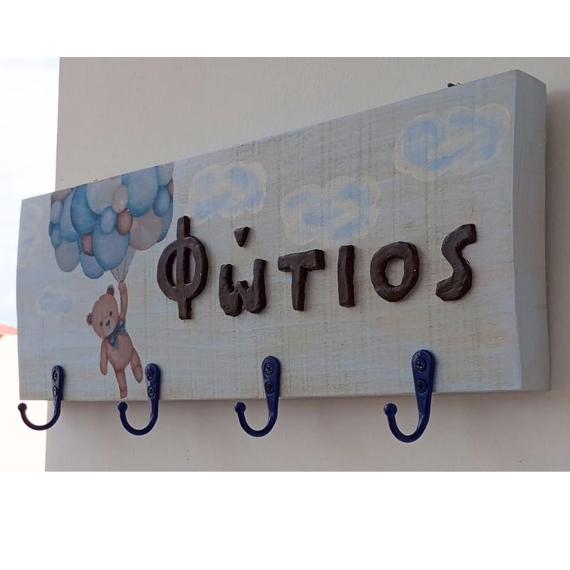 Τα χρώματα της κρεμάστρας είναι γαλάζιο ,μπλε και καφέ. Τα γαντζάκια έχουν χρώμα μπλε. Είναι κατασκευασμένη με την μέθοδο ντεκουπάζ και έχουν χρησιμοποιηθεί υβριδικά χρώματα για το βάψιμο του ξύλου. Από πάνω έχει περαστεί βερνίκι νερού για προστασία του ξύλου και εύκολο καθάρισμα με πανί. Τα γράμματα είναι φτιαγμένα από πηλό αέρος και έχουν ανάγλυφη ύφη.