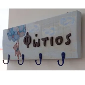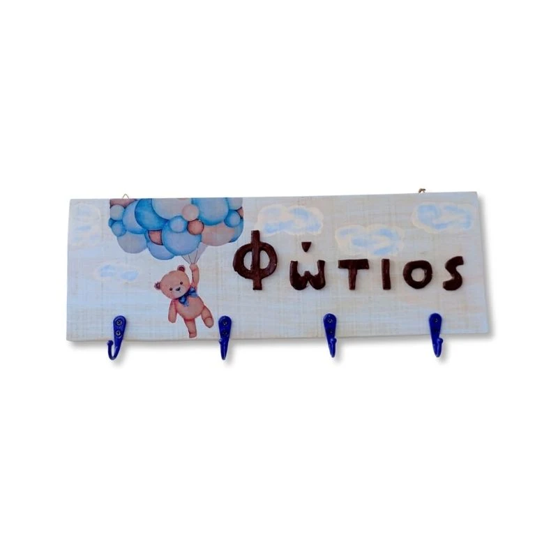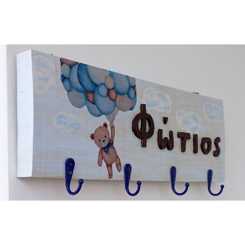Παιδική κρεμάστρα τοίχου με θέμα αρκουδάκι. Είναι φτιαγμένη από φυσικό ξύλο, διαθέτει 4 γάντζους και έχει διαστάσεις 40*15*2,5 εκατοστά.