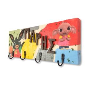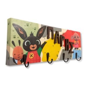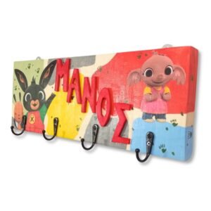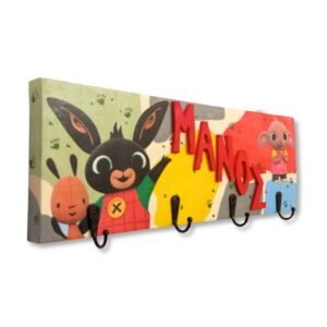 Παιδική κρεμάστρα τοίχου με όνομα για αγόρι ή κορίτσι με θέμα Μπινγκ κουνελάκι.