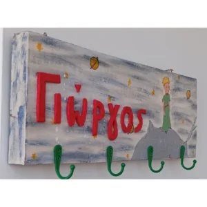 Παιδική κρεμάστρα τοίχου με θέμα τον μικρό πρίγκιπα. Είναι φτιαγμένη από φυσικό ξύλο, διαθέτει 4 γάντζους και έχει διαστάσεις 40*15*2,5 εκατοστά.