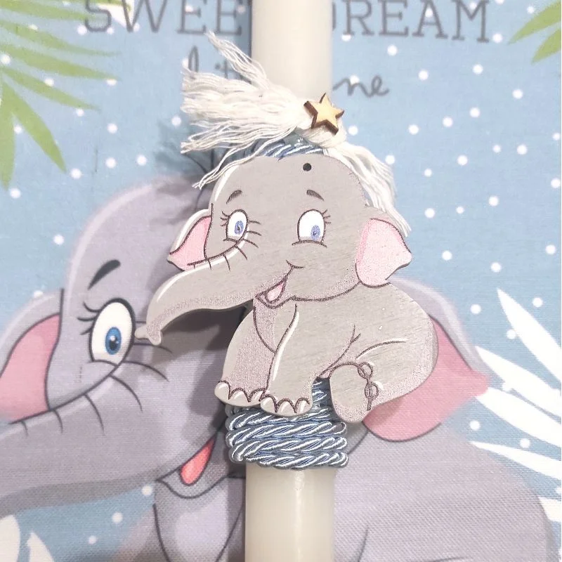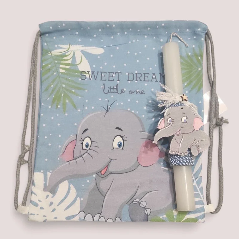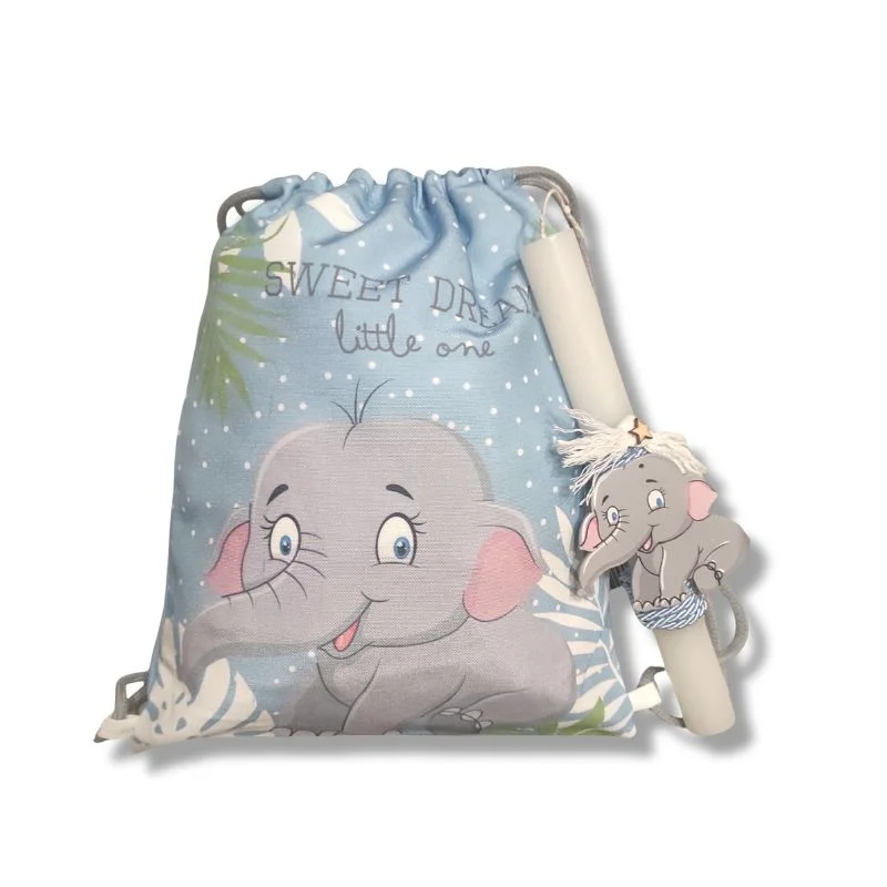 Λαμπάδα αρωματική 25εκ., με ξύλινο στοιχείο ελεφαντάκι. Το τσαντάκι που την συνοδεύει έχει διαστάσεις 25Χ30εκ.