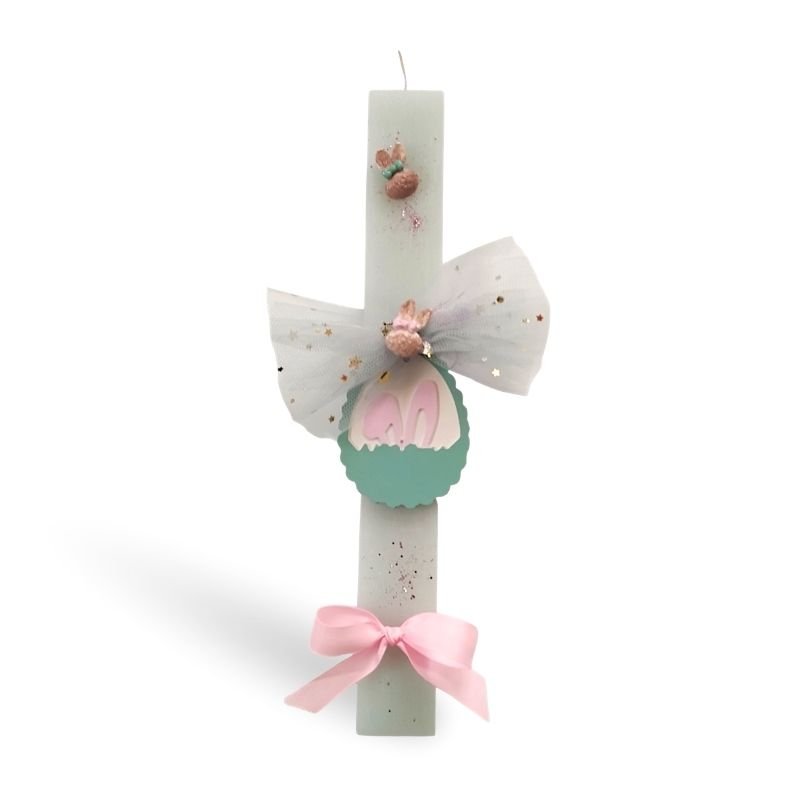 Παιδική πασχαλινή λαμπάδα με πορσελάνινο λαγουδάκι και παστέλ λεπτομέρειες (30εκ)