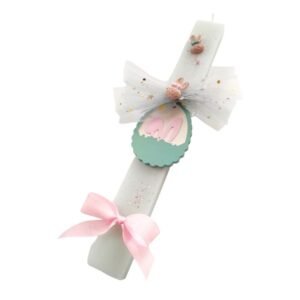 Πασχαλινή λαμπάδα σε απαλή γκρι απόχρωση, διακοσμημένη με χαριτωμένο πορσελάνινο λαγουδάκι σε παστέλ τόνους. Ο εντυπωσιακός τόνος από τούλι με χρυσά αστεράκια και οι ροζ λεπτομέρειες χαρίζουν μία ανοιξιάτικη, ονειρική αισθητική που θα λατρέψουν τα κορίτσια.