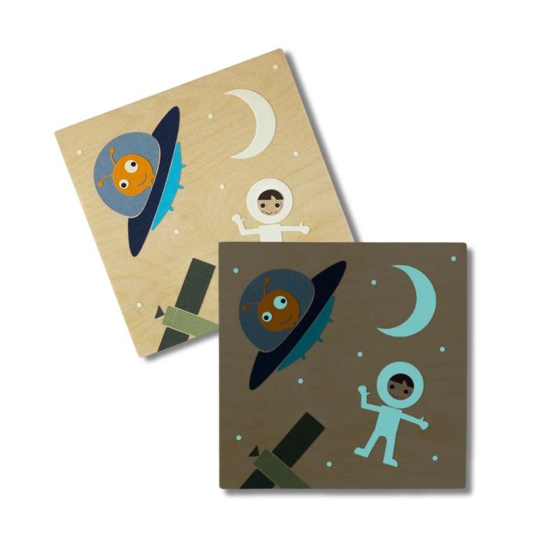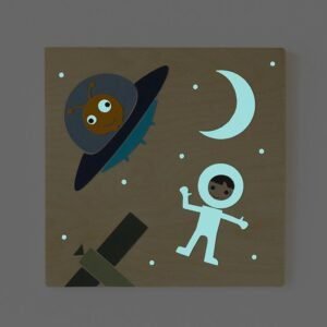 Ταξίδι στο διάστημα με μια φωσφόριζέ στολή αστροναύτη ανάμεσα στο λαμπερό φεγγάρι και τα αστέρια! Το ξύλινο κάδρο προσδίδει φυσικότητα και ζεστασιά στο παιδικό δωμάτιο και αποτελεί μια μοναδική επιλογή για γονείς, νονούς και φίλους που δίνουν αξία στα φυσικά υλικά. Είναι χειροποίητος, κατασκευάζεται με την τεχνική του κολλάζ και είναι έτοιμος να κρεμαστεί.