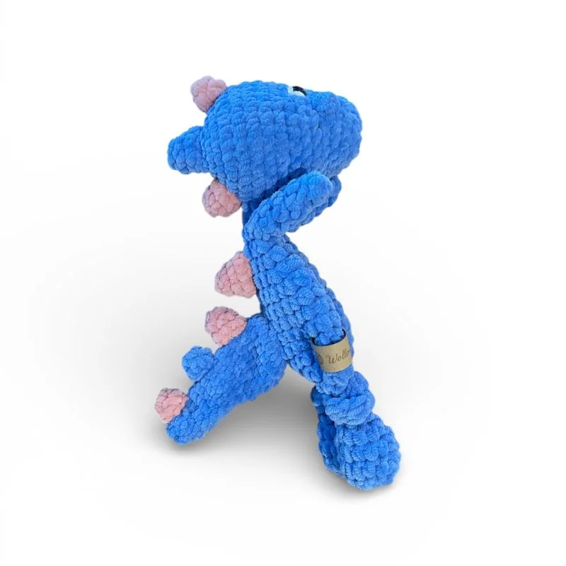 Ο δεινόσαυρος έχει απαλά πλεκτά χαρακτηριστικά και παιχνιδιάρικες λεπτομέρειες που τραβούν την προσοχή, ενώ η μαλακή υφή του προσφέρει αίσθηση ασφάλειας και ζεστασιάς. Τα κεντητά στοιχεία τον καθιστούν απόλυτα ασφαλή για χρήση από μωρά και μικρά παιδιά.