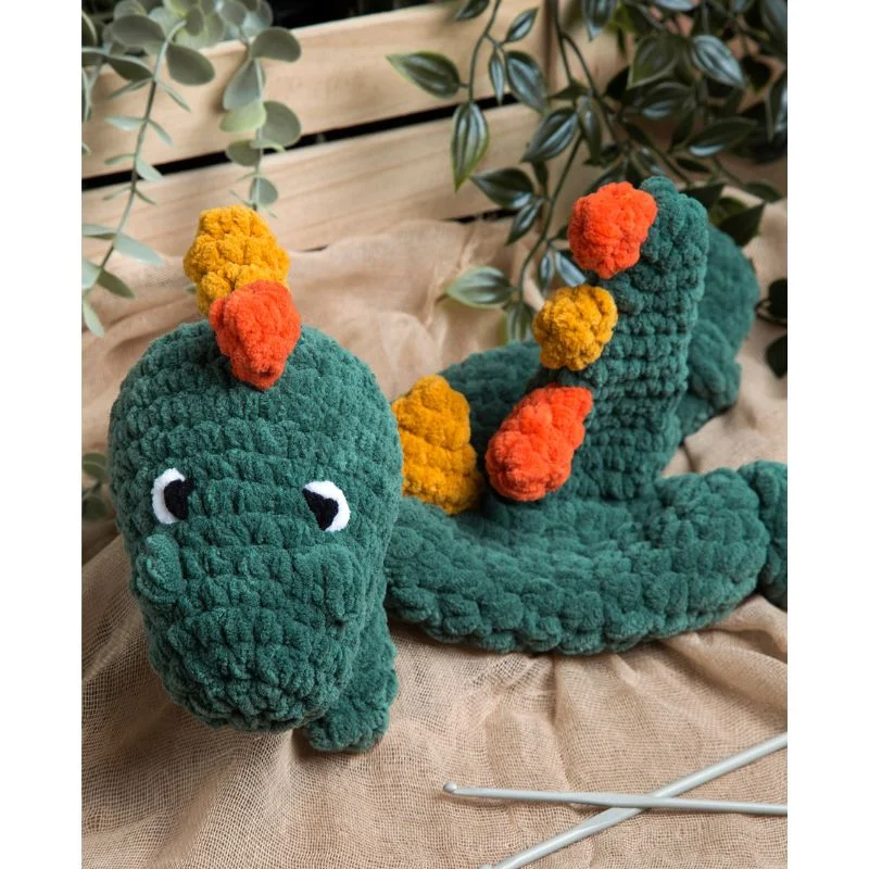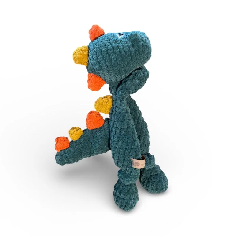 Ο δεινόσαυρος έχει απαλά πλεκτά χαρακτηριστικά και παιχνιδιάρικες λεπτομέρειες που τραβούν την προσοχή, ενώ η μαλακή υφή του προσφέρει αίσθηση ασφάλειας και ζεστασιάς. Τα κεντητά στοιχεία τον καθιστούν απόλυτα ασφαλή για χρήση από μωρά και μικρά παιδιά.