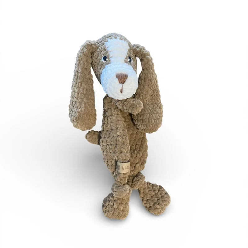 Ο σκύλος έχει απαλά πλεκτά χαρακτηριστικά και παιχνιδιάρικες λεπτομέρειες που τραβούν την προσοχή, ενώ η μαλακή υφή του προσφέρει αίσθηση ασφάλειας και ζεστασιάς. Τα κεντητά στοιχεία τον καθιστούν απόλυτα ασφαλή για χρήση από μωρά και μικρά παιδιά.